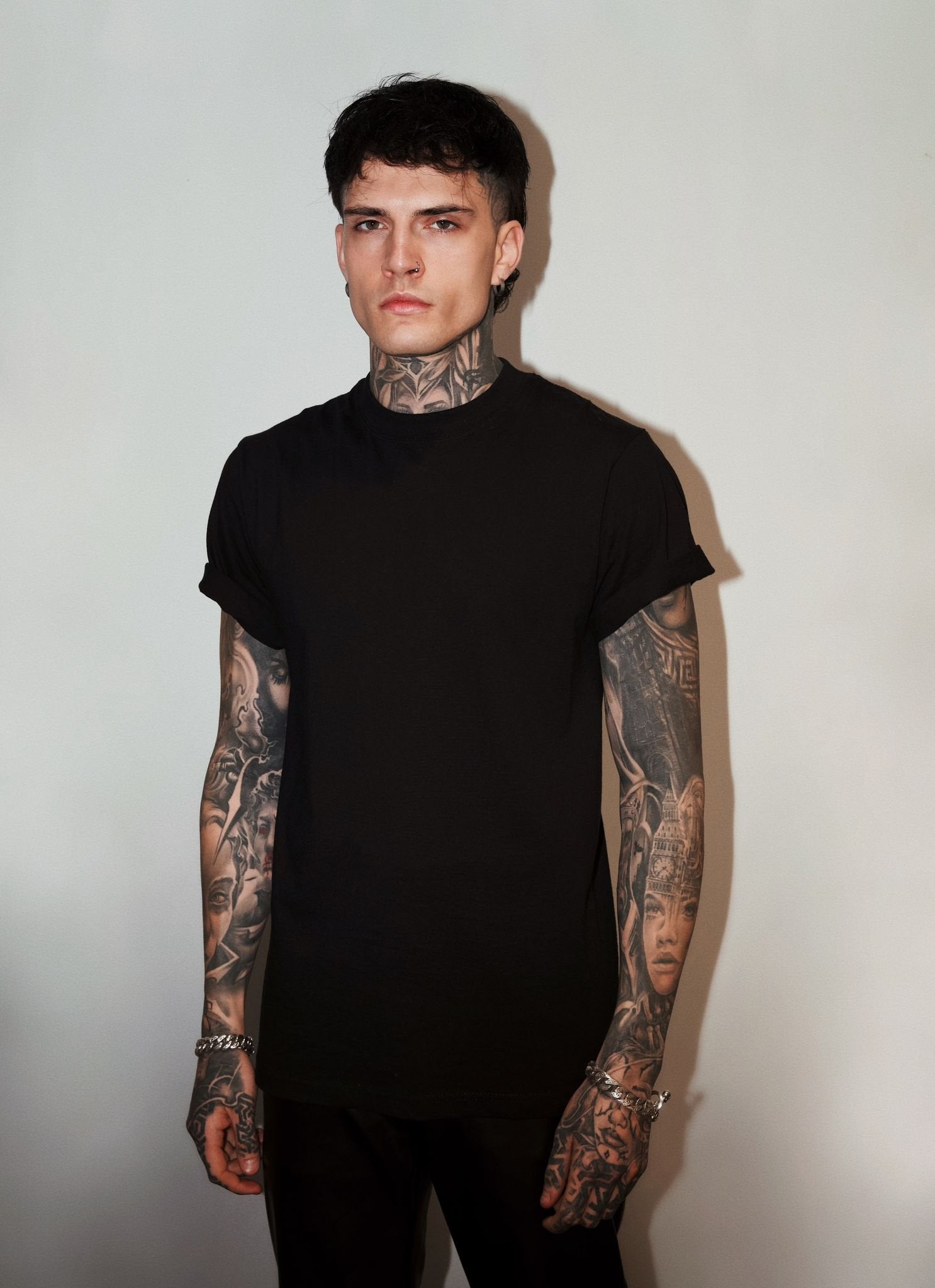 Cut from heavyweight cotton with rolled sleeves and a relaxed fit, it keeps things minimal at the front and all-out statement at the back.
