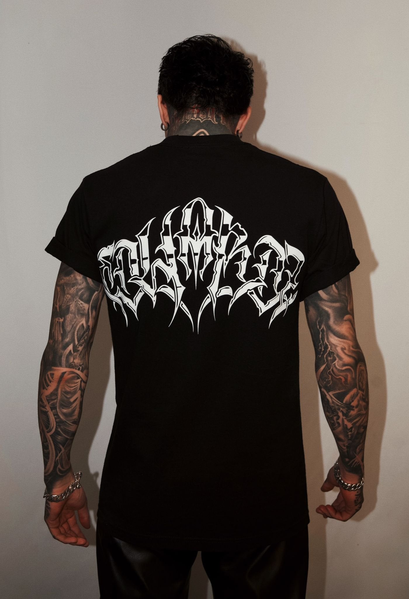 Bold from behind, stripped up front. The Edwardz Back shirt features a sharp white screen print across the shoulders in custom calligraphic lettering; loud, angular, and unapologetic.